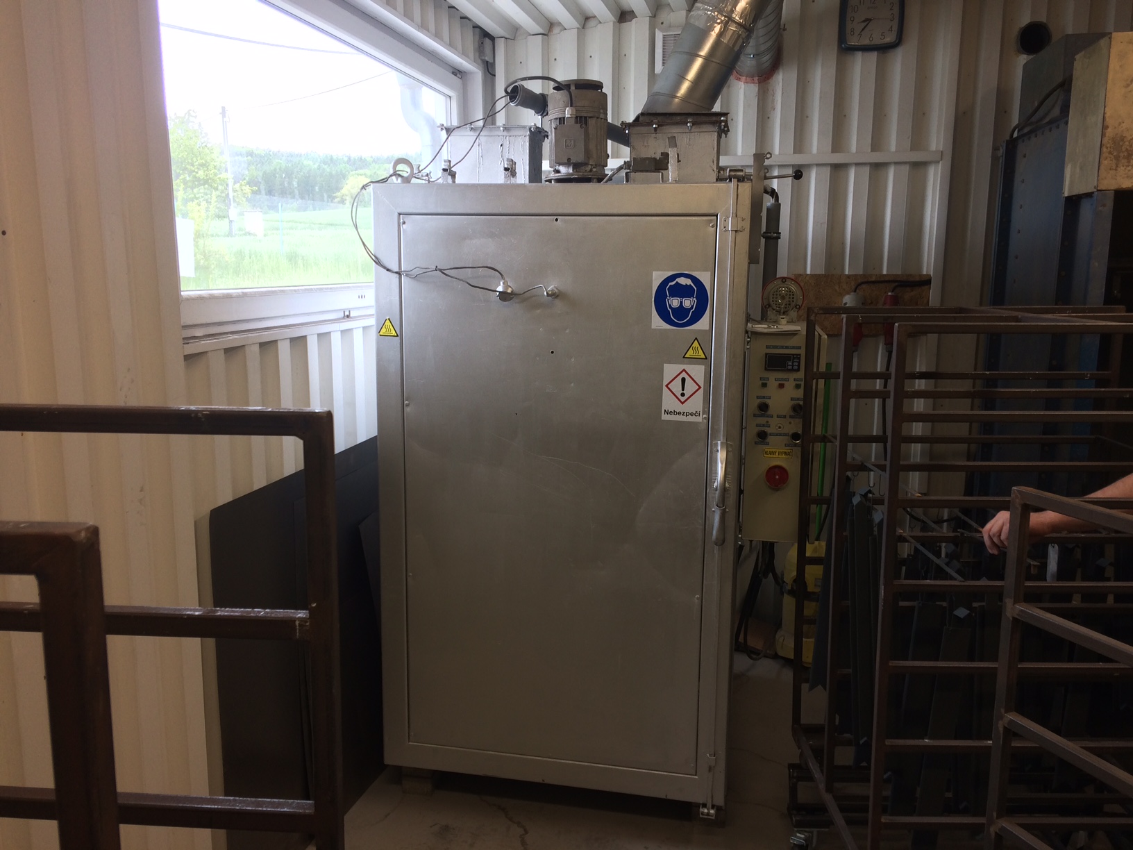 Vypalování (ucelení) povrchu probíhá nánosu v lakovací kabině ve vypalovací peci a to v závislosti na typu barvy a povrchu po dobu 20 minut při teplotách 190-210C. My používáme elektrickou vypalovací pec s 12Kw příkonem a kontrolou topného a cirkulačního procesu s 12-ti topnými patronami.